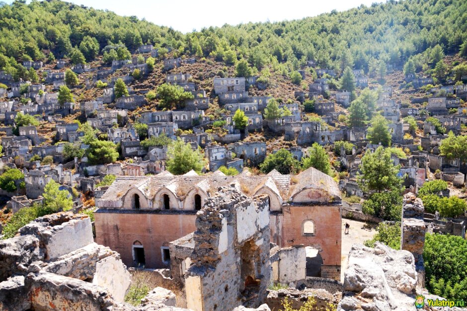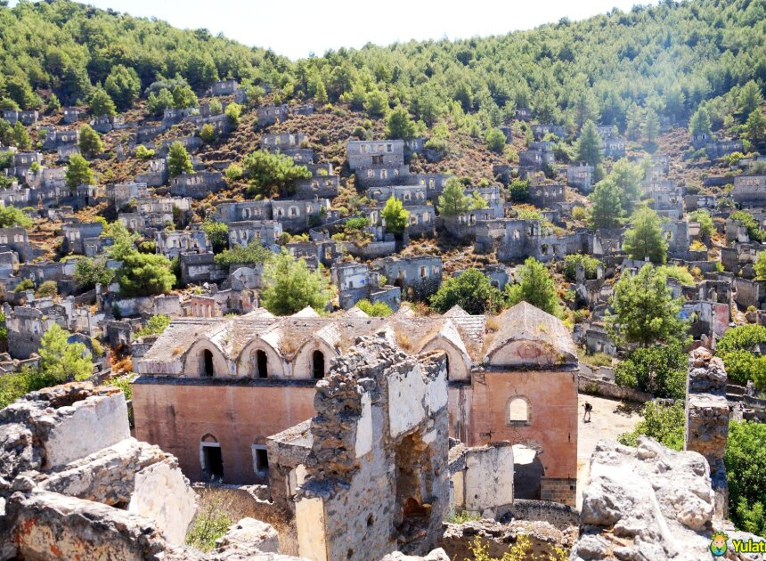 Каякёй очень необычная деревня, скрытая в горах между Фетхие и Олюденизом. Здесь рядом находится городок-призрак, где 100 лет назад были жилыми 3,5 тысячи домов, 3 церкви и больница. Само поселение было основано греками в 18 веке и называлось Лебессос. Но по окончанию турецкой войны 1923 году селение опустело, греки были вынуждены покинуть свои дома. В окрестностях сохранилось много греческих храмов. Один из них расположен прямо в скале высоко над море, имеет несколько этажей, а на стенах сохранилась краска от изображений святых. Вам понравится эта прогулка, как природными видами, так и множеством исторических следов на пути.