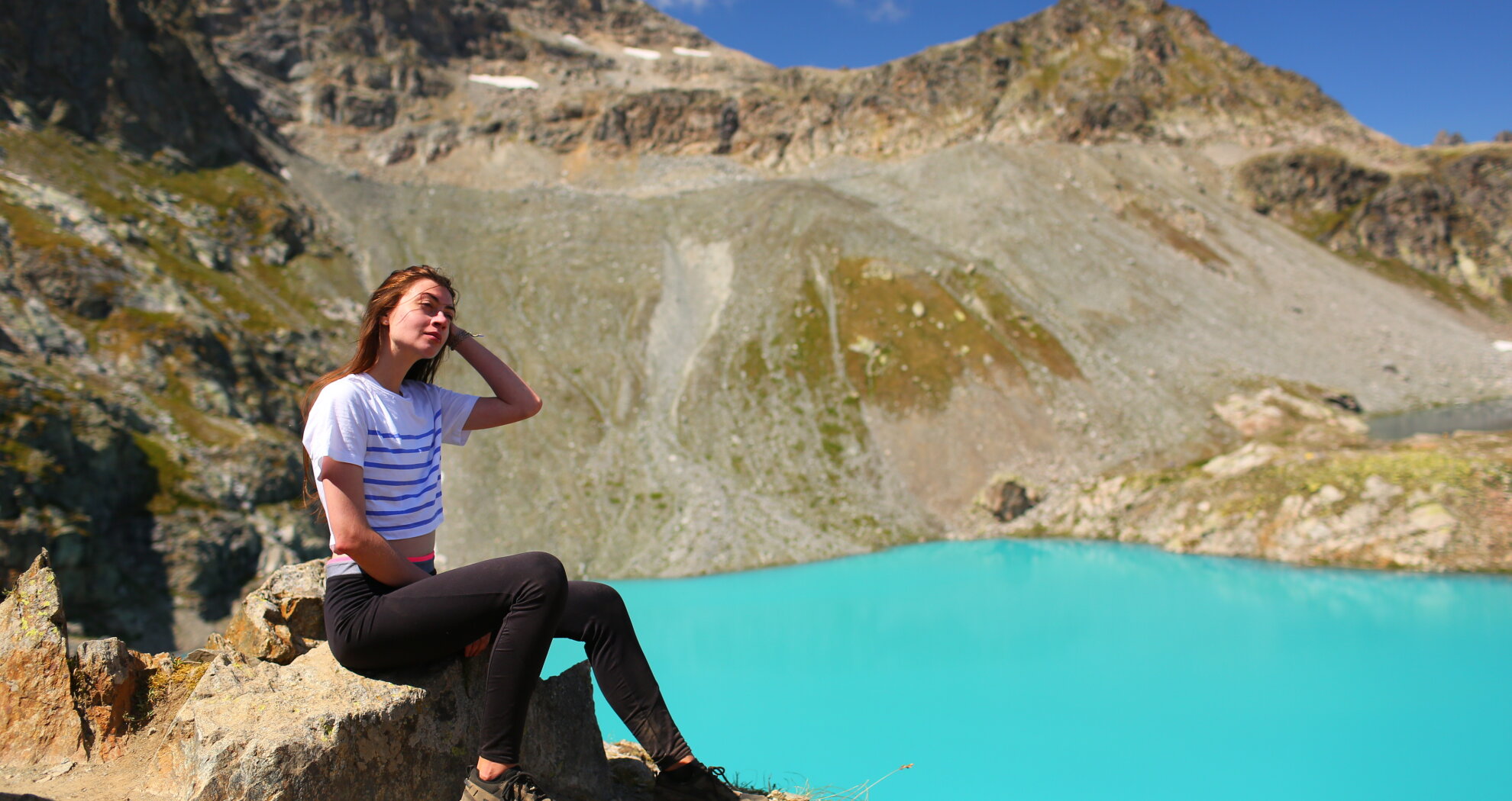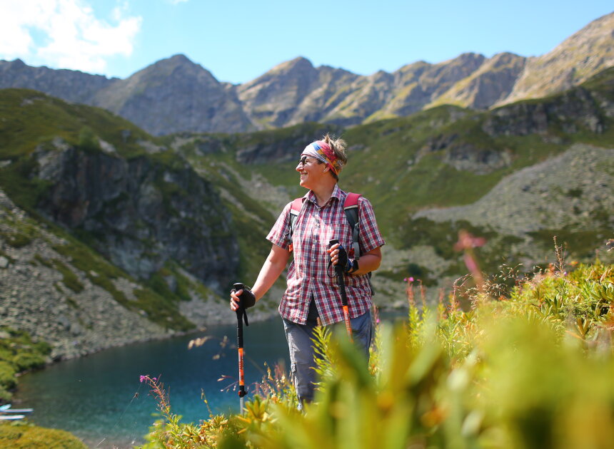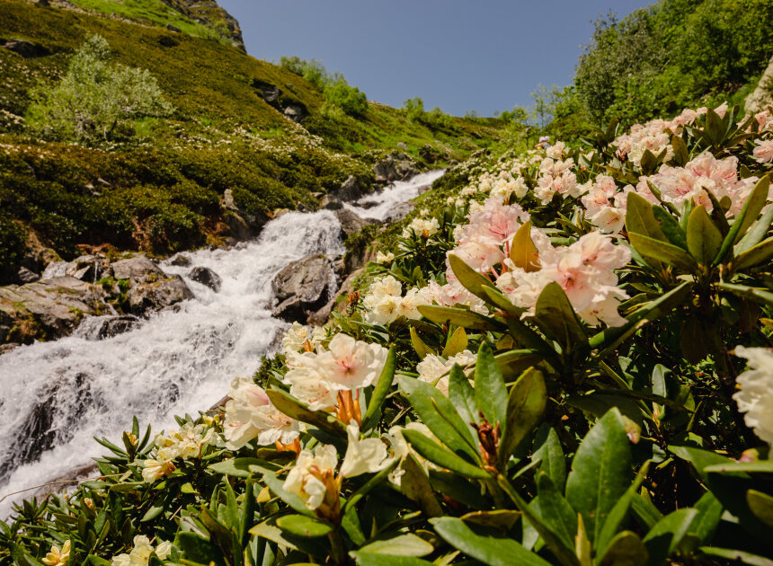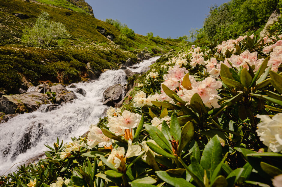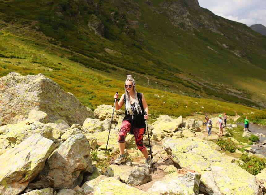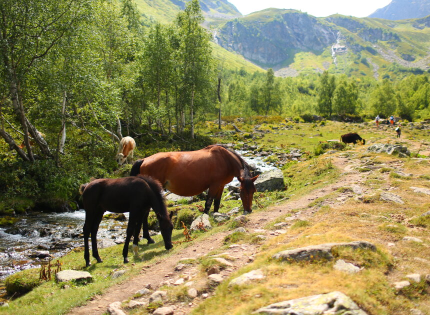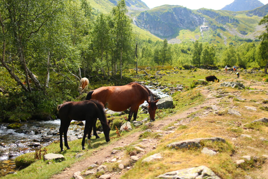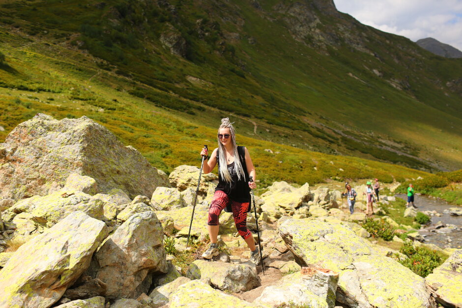 Сегодня путь проходит вдоль реки Малая Дукка. Тропа проходит по альпийским лугам, вдоль спокойно реки с уютными полянами. Потом дорожка начинает забирать круче, река становится стремительней, луга сменяются рододендронами и камнями покрытыми цветными мхами. Далее мы увидим целый комплекс озер, которые расположены на разных высотах и носят причудливые названия: Рыбка, Сказка.