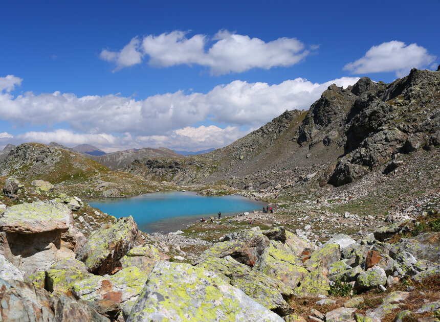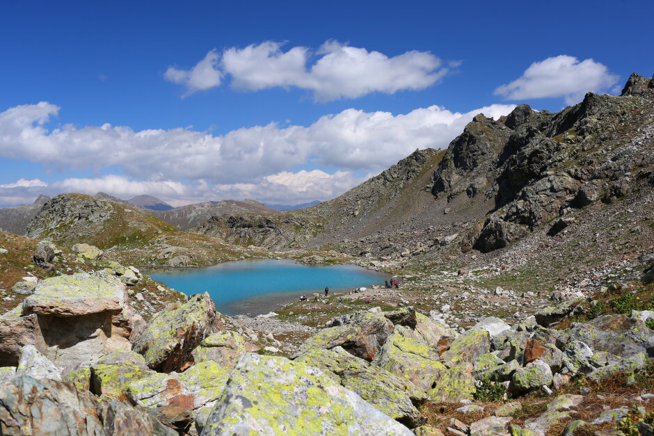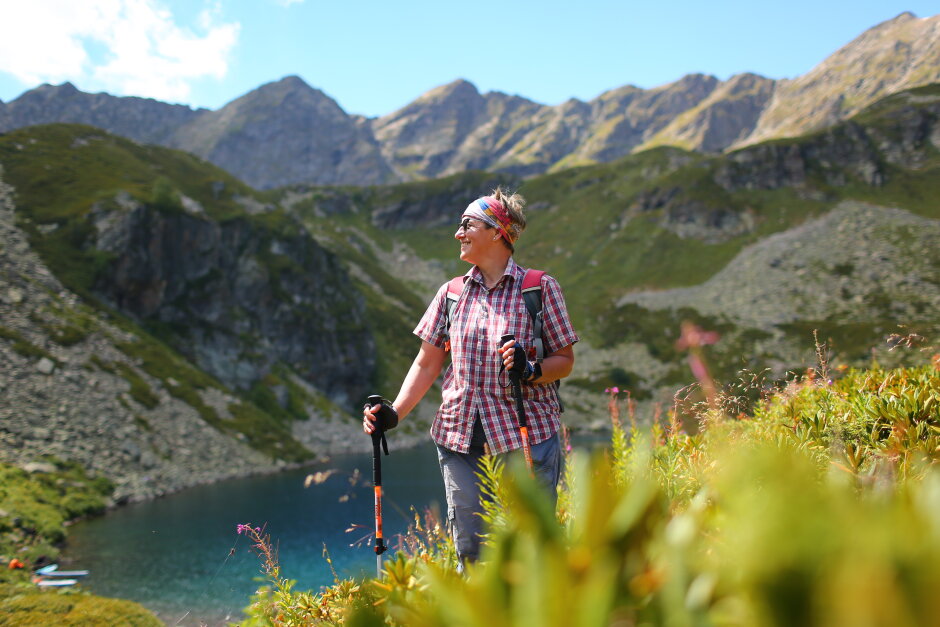 Завтракаем и идем в трекинг к озеру Семицветное. Маршрут к озеру идет с плавным набором высоты через цветущие луга и склоны покрытые кустами сладкой малины. Дно озеро сложено из таких минералов и имеет такой состав, что в солнечную погоду поверхность воды переливается всеми цветами радуги.