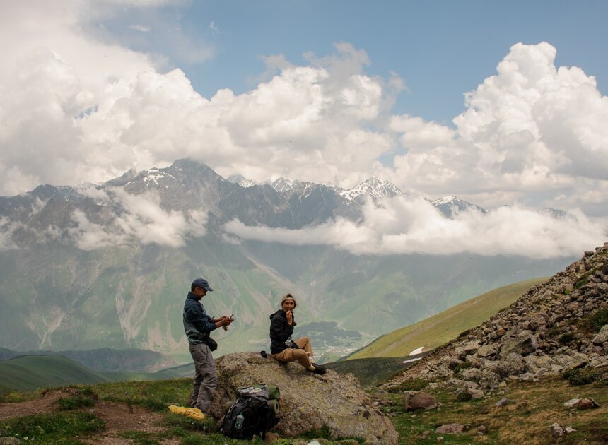 Маршрут начинается в поселке Гергети и проходит по среднему морению между реками Чхери и Блота. Осмотрев долину, поднимаемся на горный отрог, который разделяет два крупных ледника у подножья горы Казбек: Гергетский и Абано. По пути нам открываются захватывающие виды на горы Большого Кавказа: Орлиную вершину, горы Куру и Ангелогисцта, которые возвышаются над Степенцминда. Эти вершины предстают перед нами в своем великолепии, величественные и неприступные. Главной достопримечательностью этого района является Казбек (высота 5054 м). Прогулка среди березовых лесов переходит в прогулку по просторам альпийских лугов. Мы поднимаемся на смотровую площадку, где готовим обед и наслаждаемся красотой.